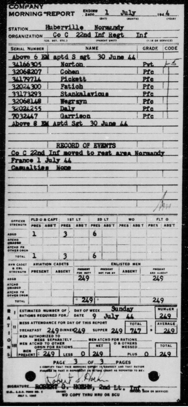Morning Reports for Company “C,” 22nd Infantry Regiment. July 1944. U.S. Army Morning Reports, c. 1912–1946. Record Group 64, Records of the National Archives and Records Administration. National Archives at St. Louis, Missouri. https://s3.amazonaws.com/NARAprodstorage/lz/partners/st-louis/rg-064/85713825-wwii/85713825_1944-07/85713825_1944-07_Roll-0770/85713825_1944-07_Roll-0770-05.pdf