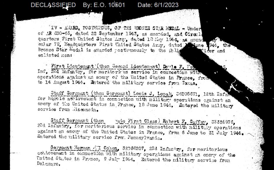The Cohen family had been notified of Sergeant Cohen’s death by July 31, 1944, when the sad news appeared in Journal-Every Evening. He was posthumously awarded the Bronze Star Medal per General Orders No. 80, Headquarters 4th Infantry Division, dated October 29, 1944. The citation stated that Cohen had received the award “for meritorious achievement in connection with military operations against an enemy of the United States in France, 9 July 1944.”