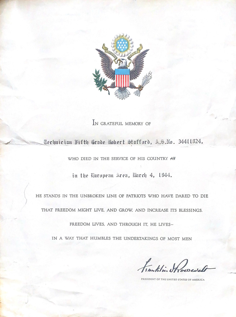 Author’s note: Delaware’s World War II Fallen occasionally highlights men and women without a direct connection to the First State. I felt compelled to tell Technician 5th Grade Stafford’s story after coming across it while doing research for another article.