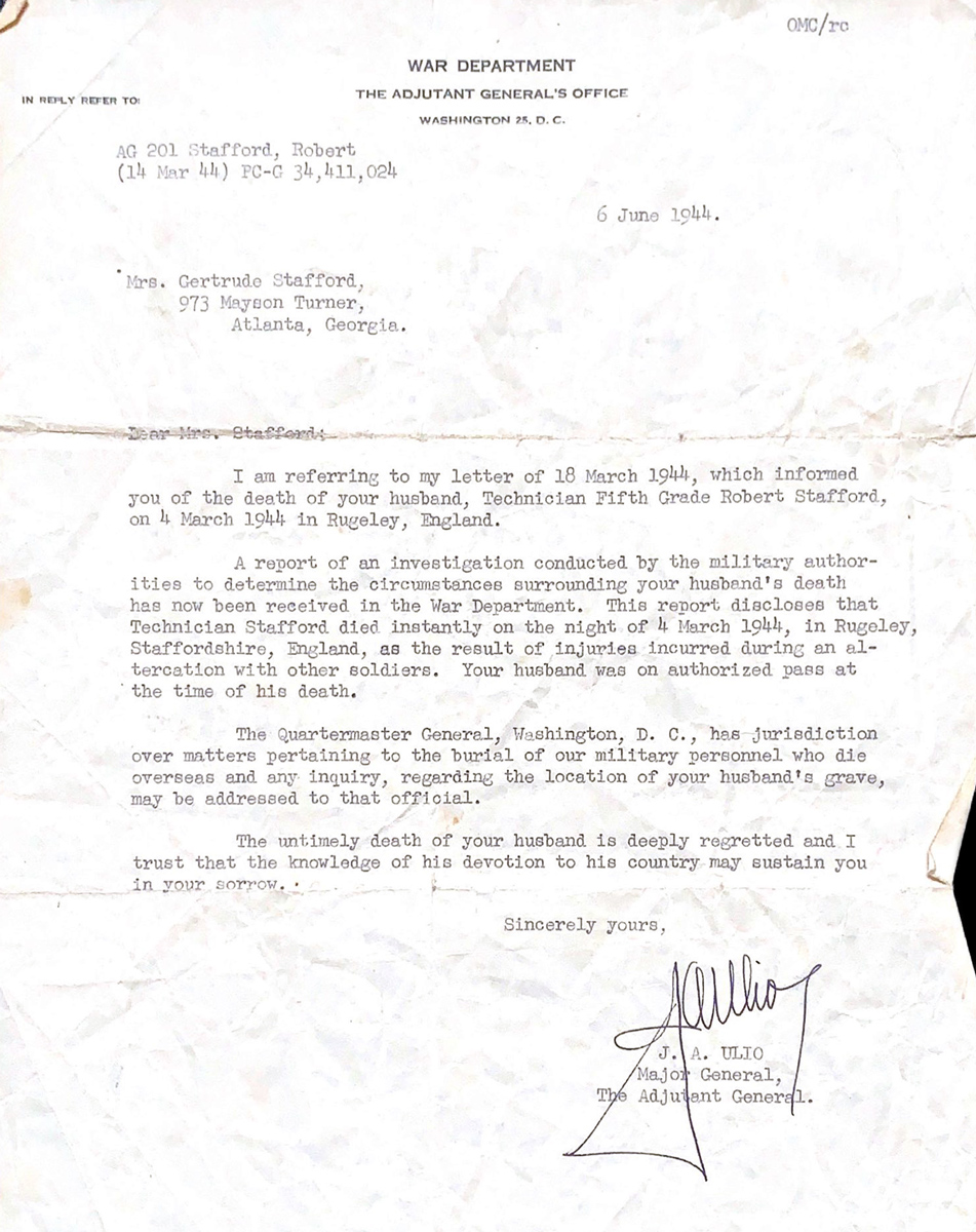 A report of an investigation conducted by the military authorities to determine the circumstances surrounding your husband’s death has now been received in the War Department. This report discloses that Technician Stafford died instantly on the night of 4 March 1944, in Rugeley, Staffordshire, England, as the result of injuries incurred during an altercation with other soldiers. Your husband was on authorized pass at the time of his death.