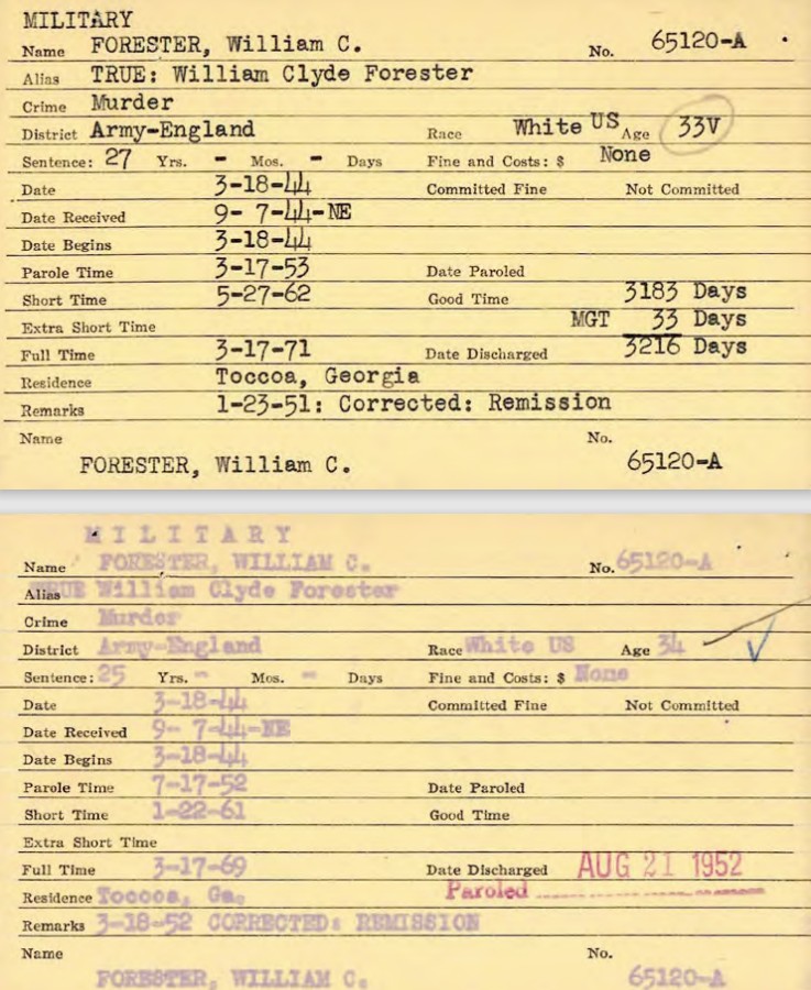 Prisoner Index Card for William Clyde Forester. Index to Prisoners, 1902–1973. Record Group 129, Records of the Bureau of Prisons, 1870–2009. National Archives at Atlanta, Georgia. https://s3.amazonaws.com/NARAprodstorage/lz/atlanta/rg-129/6087807/289843728-026/289843728-026-02.pdf