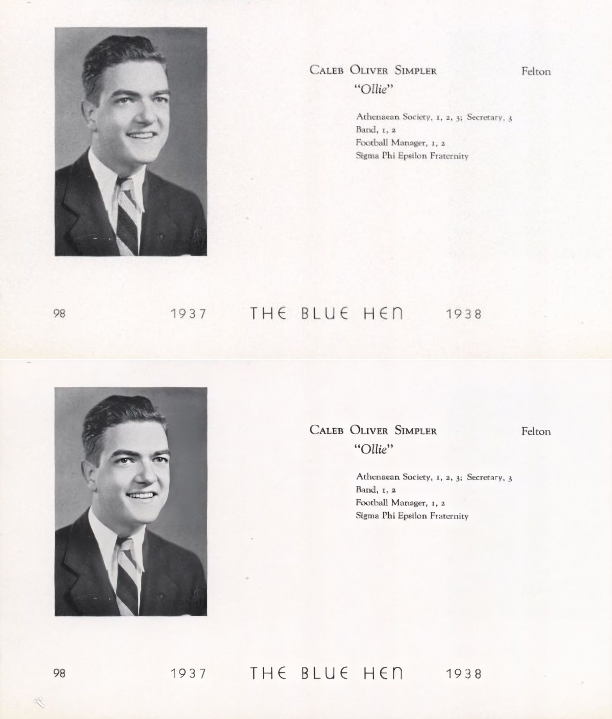 The Blue Hen photo on this page was digitally enhanced using tools on the genealogy website MyHeritage. This software is useful in instances where the only known photograph is of limited resolution (due to the resolution of yearbook printing). I believe it to be an accurate reconstruction, but the software could potentially introduce errors by misinterpreting fuzzy details in the original photograph. A comparison of the original and enhanced versions of the photos can be viewed below.