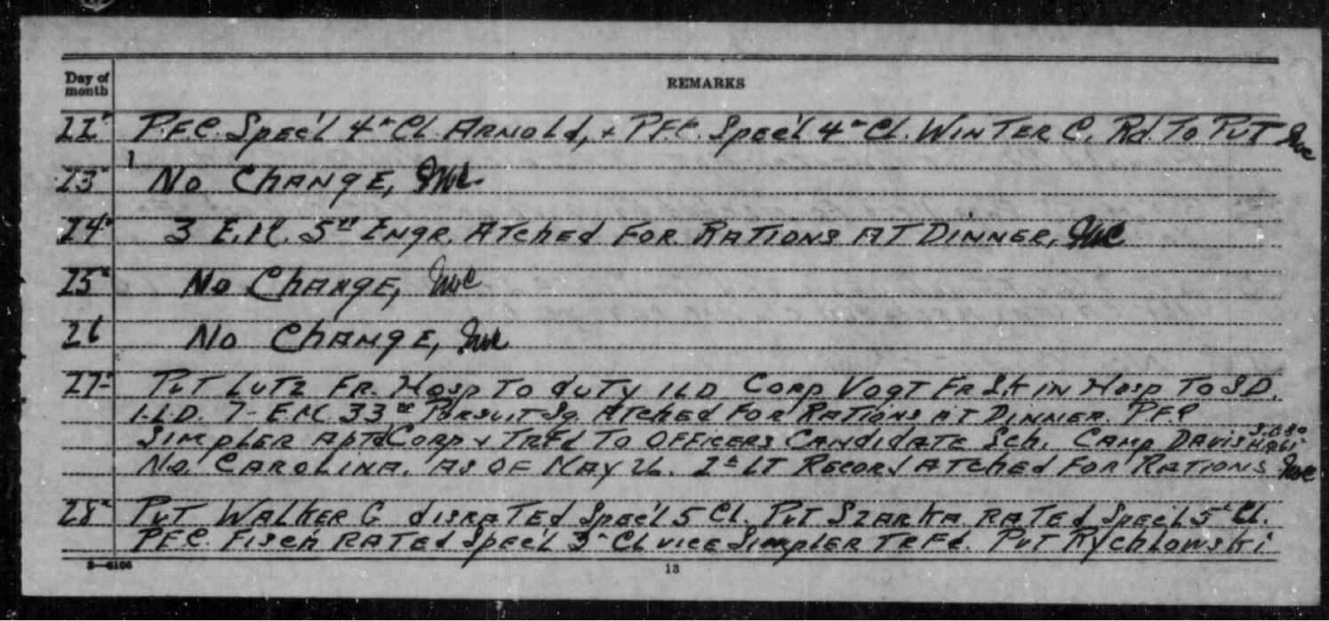 Simpler was promoted to private 1st class on February 10, 1942. Battery rosters indicate that Private Simpler’s military occupational specialty (M.O.S.) code was listed as 052 (chief clerk), and his duty code as 055 (clerk, general).