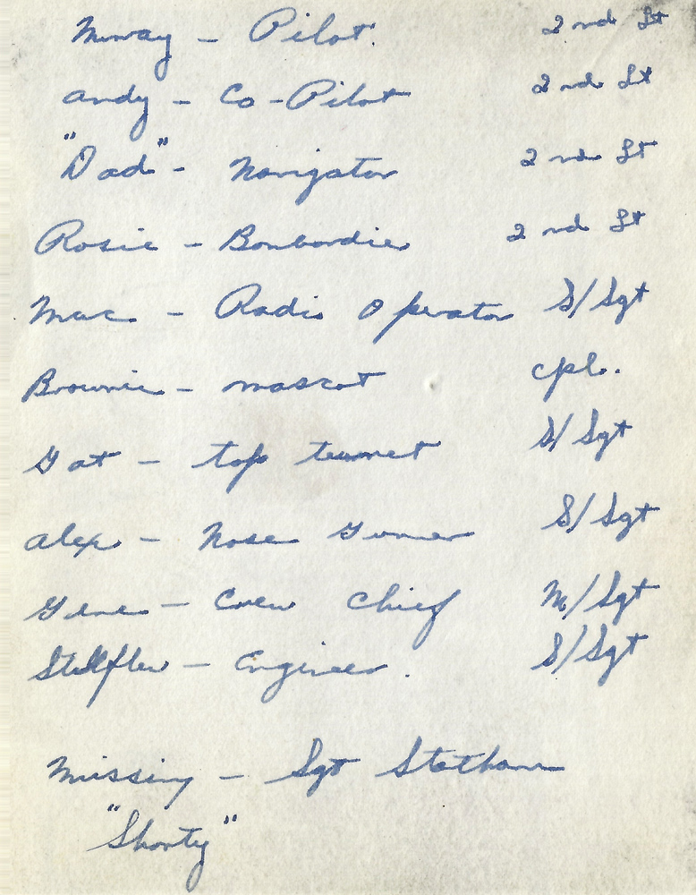 The following list was adopted from Missing Air Crew Report No. 5241 with grade, name, service number, position, and status (killed or captured). At least one and probably two crew positions listed below are inaccurate: see the Notes section for further information.