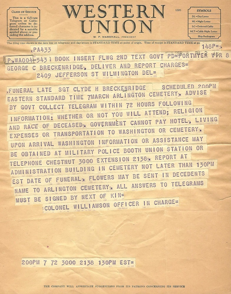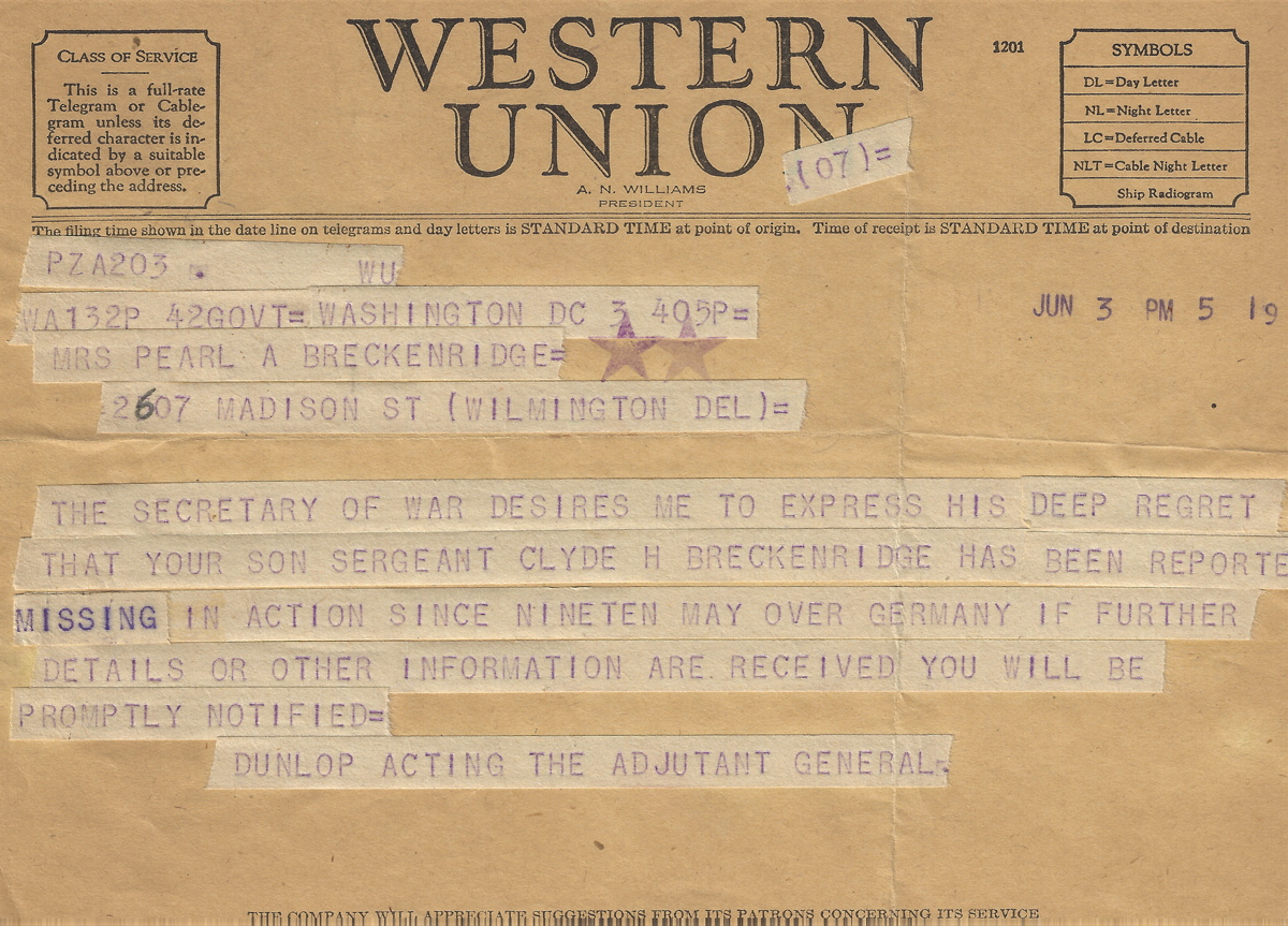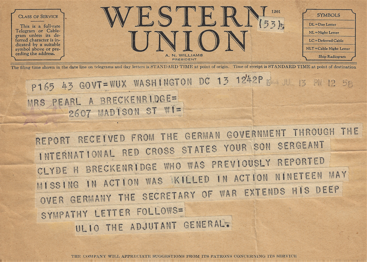 Sergeant Breckenridge’s parents learned that their son was missing on or about June 3, 1944, when the War Department sent a telegram. On July 13, 1944, the War Department received confirmation of Breckenridge’s death from the Germans via the International Red Cross.