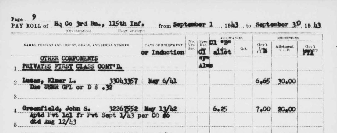 A payroll record stated that Greenfield was promoted to private 1st class effective September 1, 1943, per Company Order No. 6, dated August 12, 1943.