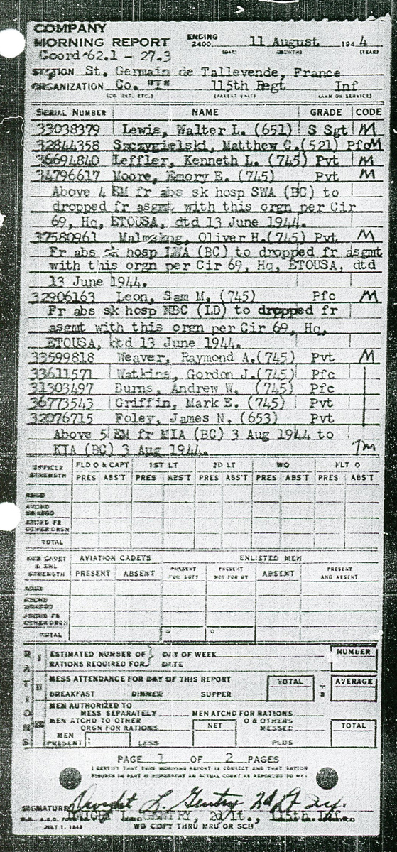 With the passage of decades, Gentry did not recall the name of the squad leader by the time he recounted the story to Balkoski. Of course, it is impossible to confirm with absolute certainty that Foley’s squad was the one involved in the incident. Company “I” morning reports recorded nine men missing in action on August 3, 1944. Six were riflemen and all nine were at the grade of private or private 1st class.