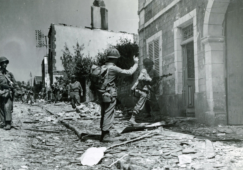 In the meantime, the U.S. First Army launched Operation Cobra on July 25, 1944, finally breaking the deadlock. Although the Allies finally broke out into open country, the fighting in Normandy was not quite over yet. On the afternoon of July 29, 1944, Bellow’s battalion moved by truck to Saint-Lô, a crossroads city that had been all but destroyed during the recent fighting. 3rd Battalion continued another five miles southwest of the city. Bellow’s battalion came under some artillery fire and that night German aircraft bombed the area, but they sustained no casualties. 3rd Battalion continued south by during the subsequent days but saw little sign of the enemy.