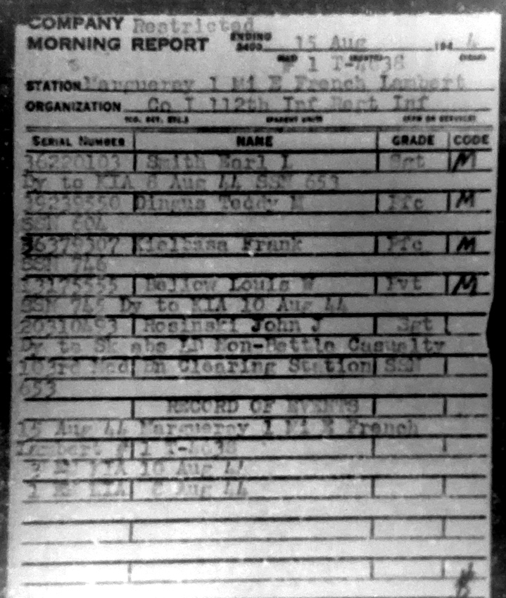 Morning Reports for Company “I,” 112th Infantry Regiment. July 1944 – August 1944. U.S. Army Morning Reports, c. 1912–1946. Record Group 64, Records of the National Archives and Records Administration. National Archives at St. Louis, Missouri.