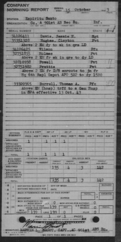 Morning Reports for Company “A,” 901st Airbase Security Battalion. October 1943. U.S. Army Morning Reports, c. 1912–1946. Record Group 64, Records of the National Archives and Records Administration. National Personnel Records Center, St. Louis, Missouri. https://s3.amazonaws.com/NARAprodstorage/lz/partners/st-louis/rg-064/85713825-wwii/85713825_1943-10/85713825_1943-10_Roll-0543/85713825_1943-10_Roll-0543-11.pdf