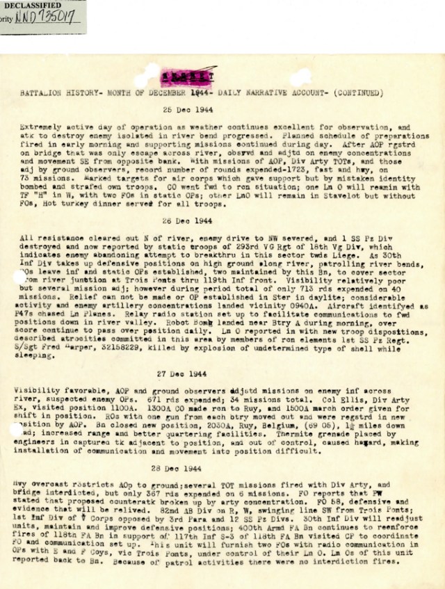 The battalion history noted Staff Sergeant Harper’s death on December 26, 1944, while his headstone and a battery morning report listed December 27, 1944. The discrepancy is most likely due to his death occurring during the night of December 26–27.