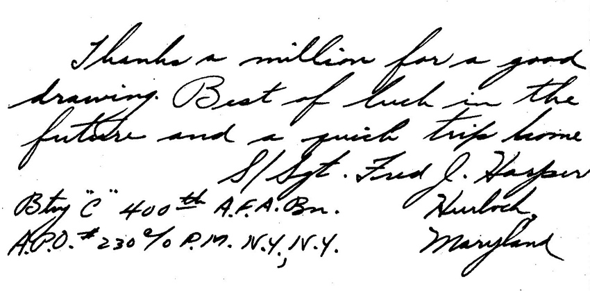 On November 23, 1944, presumably during a brief respite on pass off the line, Staff Sergeant Harper sat for a portrait drawn by Elizabeth Black of the American Red Cross. The portrait, apparently drawn in charcoal, is a serious one. As was customary for Black’s drawings, it contained a message to the subject’s family: “All my love, Fred” is written in the lower left corner. The Red Cross mailed the drawing to Hurlock, Maryland, where his wife and son were living, but many months passed before it arrived. Tragic news got there first.