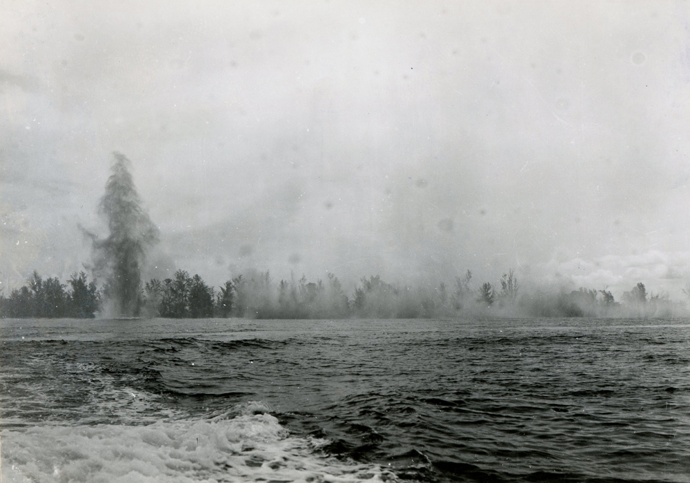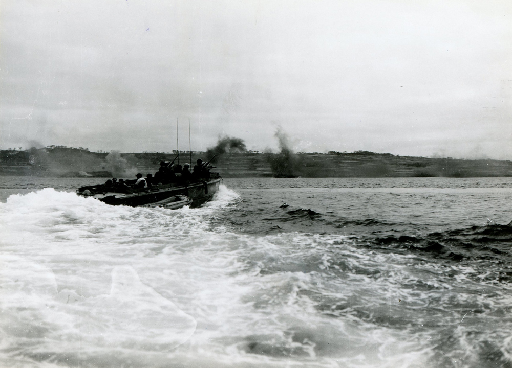 U.D.T. 11’s last operations of the war were in support of the Australian landings on Borneo. The team, now slightly understrength with 13 officers and 75 enlisted men, sailed from Morotai aboard the U.S.S. Kline on June 2, 1945, arriving in the area of Brunei Bay on the morning of June 7, 1945. At 0630 hours the following day, June 8, 1945, U.D.T. 11 boarded gunboats and landing craft to reconnoiter Brown Beach, near Ramsey Point on Labuan Island. Their mission was to determine if the Japanese had placed mines or beach emplacements, locate natural and artificial obstacles, learn about the beach’s underwater characteristics and surf conditions, and determine the best landing sites and beach exits. The landings would take place two days later on what was dubbed Z-Day (Zebra Day).