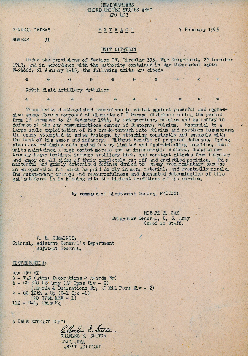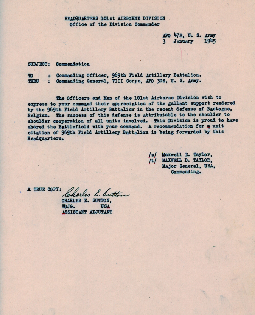 The Officers and Men of the 101st Airborne Division wish to express to your command their appreciation of the gallant support rendered by the 969th Field Artillery Battalion in the recent defense of Bastogne, Belgium.  The success of this defense is attributable to the shoulder to shoulder cooperation of all units involved.  This Division is proud to have shared the Battlefield with your command.  A recommendation for a unit citation of 969th Field Artillery Battalion is being forwarded by this Headquarters.