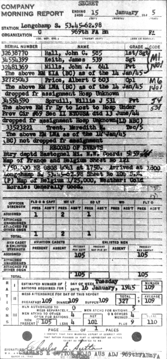 Morning Report for Battery “B,” 969th Field Artillery Battalion. January 15, 1945. U.S. Army Morning Reports, c. 1912–1946. Record Group 64, Records of the National Archives and Records Administration. National Archives at St. Louis, Missouri.