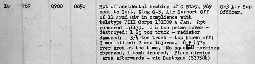 1 4 ton prime mover – destroyed: 1 2½ ton truck – radiator damaged: 1 3/4 ton truck – top blown off: 3 men killed: 2 men injured.  8 P 47’s over area at the time.  No squadron markings observed.  1 bomb dropped.  Plane circled area afterwards – vic[inity] Bastogne[.]