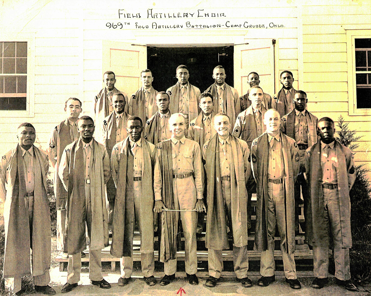 969th Field Artillery Battalion choir at Camp Gruber, Oklahoma, in 1943 or 1944. The leader of the choir, Eugene Wayman Jones (1915–1964, labeled with the arrow and number 16), rose to prominence after the war advancing the arts in the black community in Philadelphia, where he founded Heritage House and eventually had a cultural center named after him. This photo comes from the collection of 969th commanding officer Colonel Hubert D. Barnes. (Courtesy of Emily Vaill Pfaff and the Barnes family)