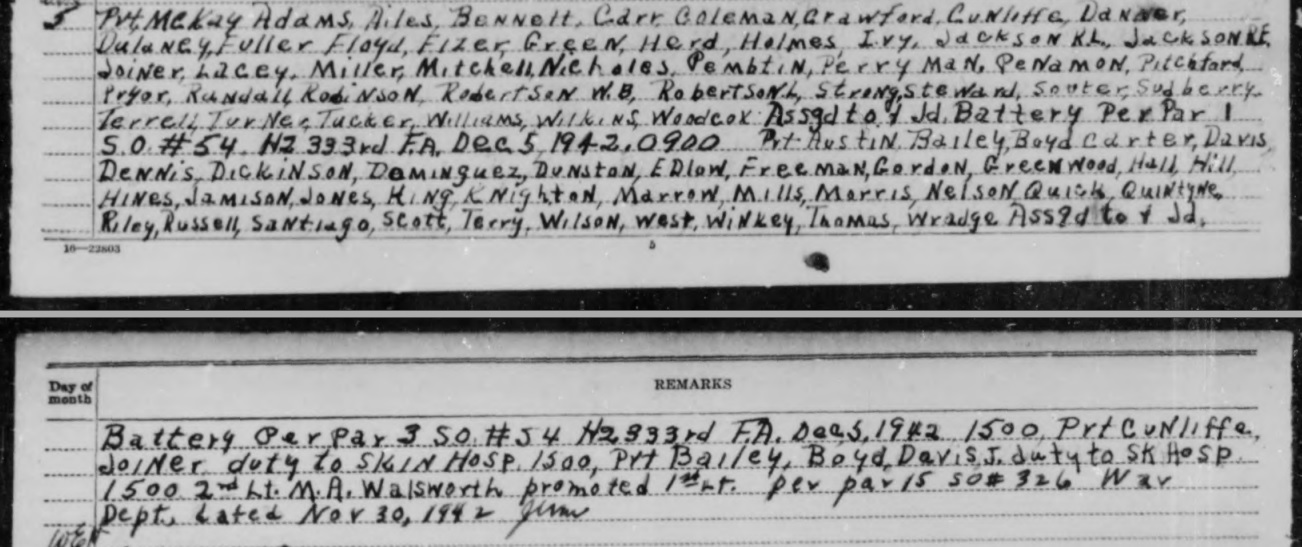 Morning Reports for Battery “F,” 333rd Field Artillery Regiment. December 1942. U.S. Army Morning Reports, c. 1912–1946. Record Group 64, Records of the National Archives and Records Administration. National Archives at St. Louis, Missouri. https://s3.amazonaws.com/NARAprodstorage/lz/partners/st-louis/rg-064/85713825-wwii/85713825_1940-01-thru-1943-07/85713825_1940-01-thru-1943-07_Roll-1294/85713825_1940-01-thru-1943-07_Roll-1294-12.pdf
