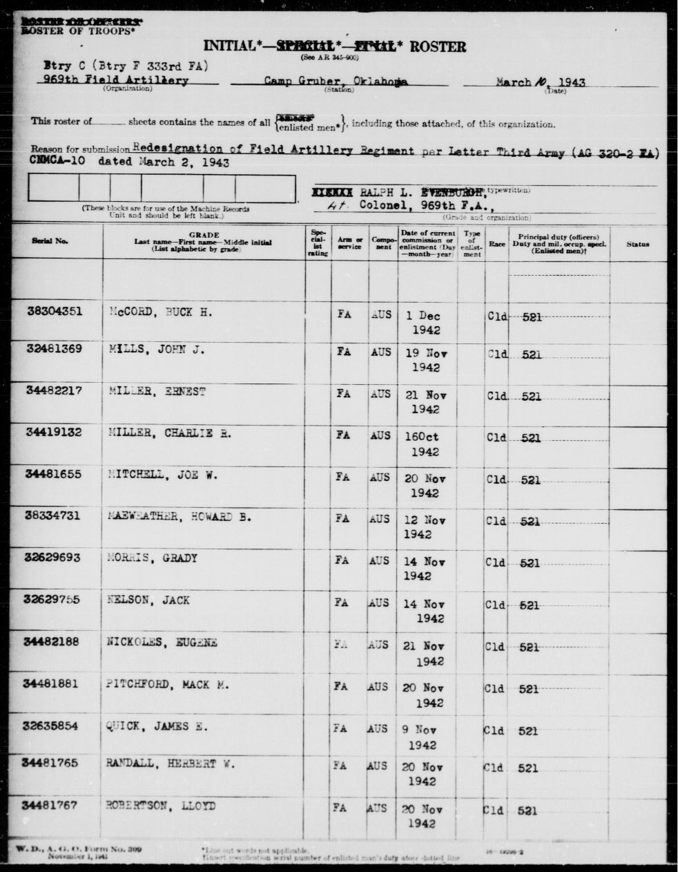 “Initial Roster Btry C 969th Field Artillery Bn.” March 10, 1943. U.S. Army Muster Rolls and Rosters, November 1, 1912 – December 31, 1943. Record Group 64, Records of the National Archives and Records Administration. National Archives at St. Louis, Missouri. https://s3.amazonaws.com/NARAprodstorage/lz/st-louis/rg-064/85713803_1940-1943/85713803_1940-1943_Roll-1366/85713803_1940-1943_Roll-1366_07.pdf