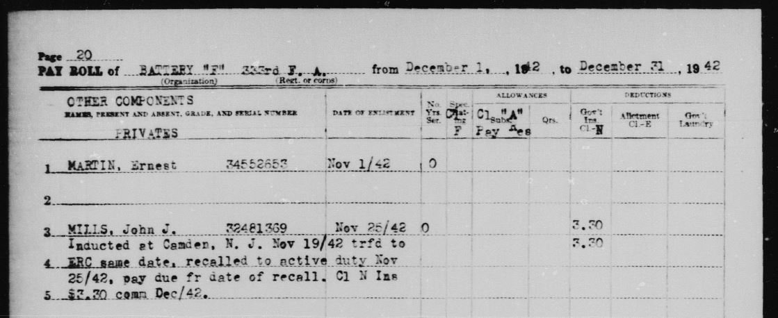 December 1942 payroll entry for Battery “F,” 333rd Field Artillery Regiment, which mentions Private Mills. Men who were drafted were typically transferred to the Enlisted Reserve Corps briefly and given a short time to settle civilian affairs before going on active duty. (National Archives)