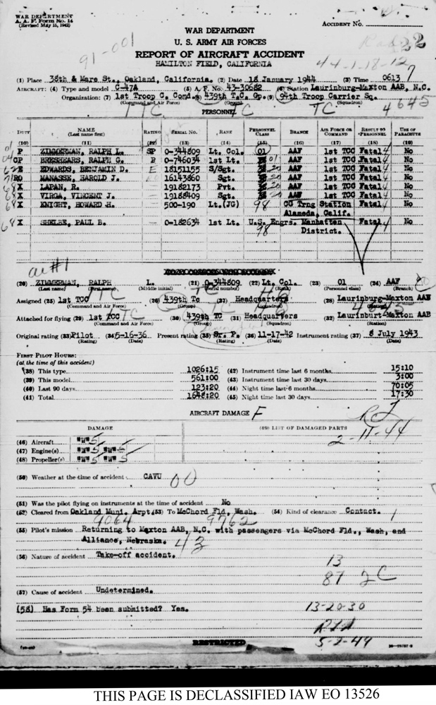 Early on the morning of January 18, 1944, Lieutenant Selbe boarded a Douglas C-47A Skytrain (serial number 43-30682) at Oakland Municipal Airport. The aircraft, piloted by Lieutenant Colonel Ralph L. Zimmerman (1910–1944) and 1st Lieutenant Ralph G. Breshears (1918–1944), belonged to the 94th Troop Carrier Squadron, 439th Troop Carrier Group, I Troop Carrier Command, based at Laurinburg-Maxton Army Air Base, North Carolina. There were four passengers and four crewmembers aboard. The aircraft was scheduled to fly to McChord Field, Washington, then back to Laurinburg-Maxton via Alliance, Nebraska. It is unclear whether Selbe was headed to the state of Washington—the Manhattan Project’s Hanford Site was a few hours from McChord Field—or back to the East Coast.