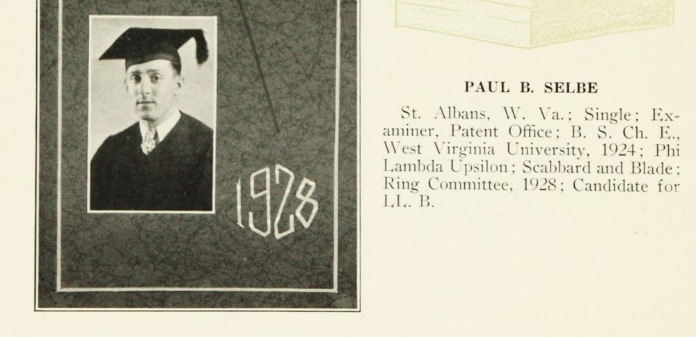 According to a letter by his father to the State of Delaware Public Archives Commission, Selbe graduated from West Virginia University with a Bachelor of Science in Chemical Engineering on June 30, 1924, and in September that same year he began working as a patent examiner for the federal government in Washington, D.C. In 1925, he enrolled in National University School of Law in Washington, D.C.