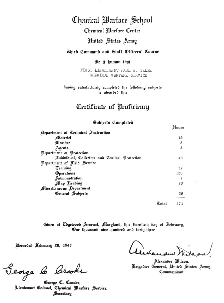 On February 20, 1943, 1st Lieutenant Selbe graduated from a 274-hour training course, the Third Command and Staff Officers’ Course at the Chemical Warfare School at Edgewood Arsenal, Maryland. Selbe also spent some time stationed at Camp Sibert Alabama. Journal-Every Evening reported that “Later he was transferred to patent work for the Army and stationed in Washington.” The article added that he “repeatedly asked for active duty”—presumably the writer meant that Selbe asked to join a combat or overseas unit, since he was already on active duty—“but in July [1943] he was transferred to California, where he was stationed at Berkeley, doing special work.”