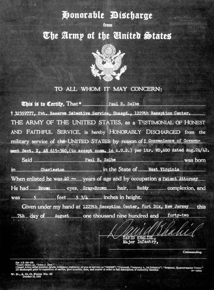 According to his father’s letter, in September 1929, Selbe was hired as a patent attorney by E. I. du Pont de Nemours and Company, better known as the DuPont Company. He was listed in a 1934 Wilmington, Delaware, directory living at 900 West 30th Street. Selbe’s address was listed in the 1938 Wilmington directory as 309 West 8th Street. He was recorded on the next census on in April 1940, living in an apartment at 309 West 18th Street in Wilmington. He remained at that address until he entered the service.