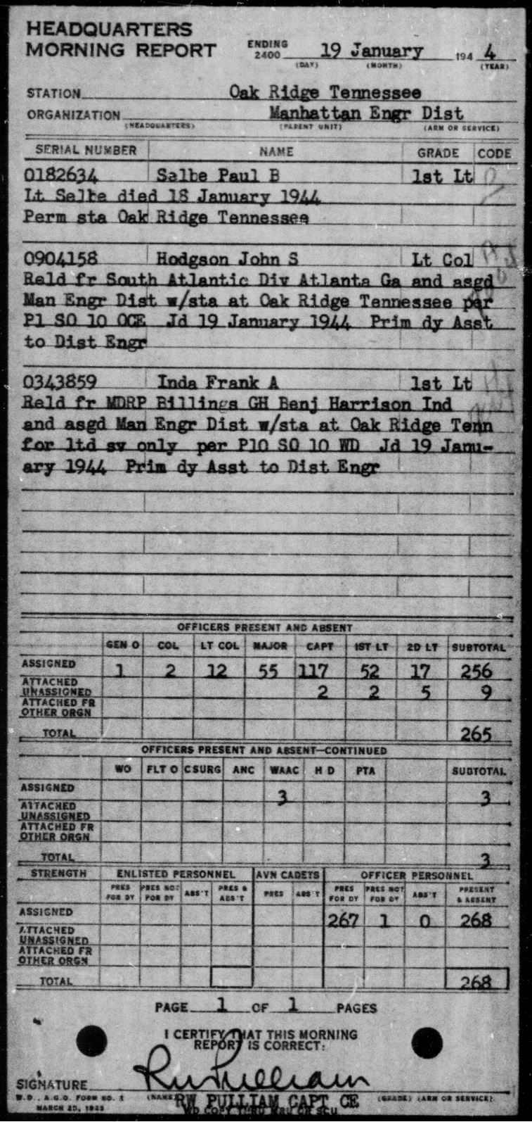 Morning Reports for Manhattan Engineer District, Oak Ridge, Tennessee. October 1943 – January 1944. U.S. Army Morning Reports, c. 1912–1946. Record Group 64, Records of the National Archives and Records Administration. National Archives at St. Louis, Missouri. https://catalog.archives.gov/id/453035509?objectPage=543, https://catalog.archives.gov/id/453035509?objectPage=544, https://catalog.archives.gov/id/453035509?objectPage=569, https://catalog.archives.gov/id/461339379?objectPage=641