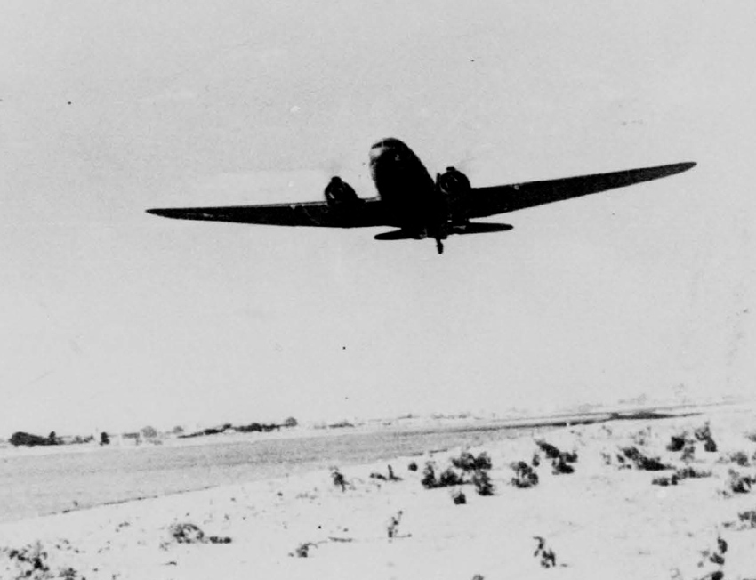 Squadron records officially placed Vaughn, McLoughry, and the most of their crew on detached service for a secret mission at 0820 hours on November 7, 1942. That night, they took off from R.A.F. Predanneck. McLoughry’s crew was assigned to D Flight, flying C-47 41-7855. The crew consisted of 1st Lieutenant Vaughn (pilot), 2nd Lieutenant McLoughry (copilot), 2nd Lieutenant Paul W. Ayers (navigator), Technical Sergeant Harry E. Keener (engineer), and Sergeant Austin E. O’Toole (radioman). Group records stated that “D flight will transport the F company and certain supplies of the [509th] Parachute Infantry.”