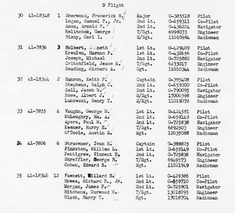 The following list was adopted from “Technical Report of Aircraft Accident Classification Committee, 43-11-29-502” with grade, name, and position. Service numbers were obtained from casualty lists.