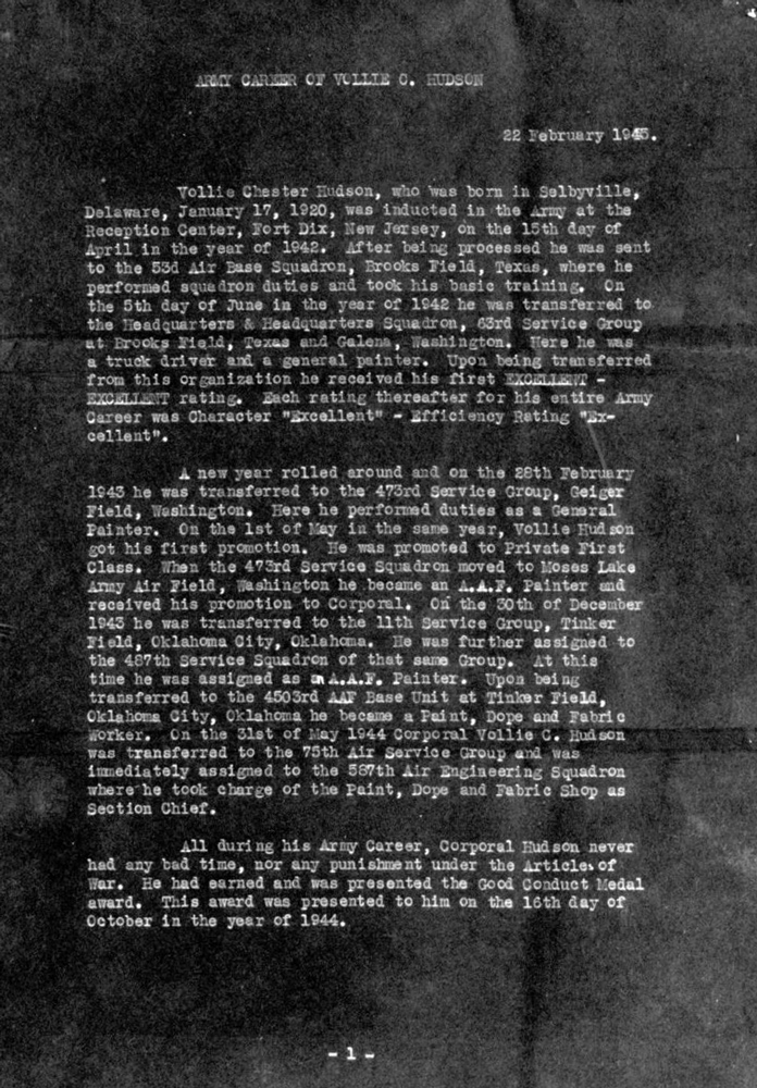 Hudson was drafted. He joined the U.S. Army at Fort Dix, New Jersey, on April 15, 1942, and was assigned to the Army Air Forces. In a statement for the State of Delaware Public Archives Commission, Hudson’s mother provided a detailed list of where her son was stationed: