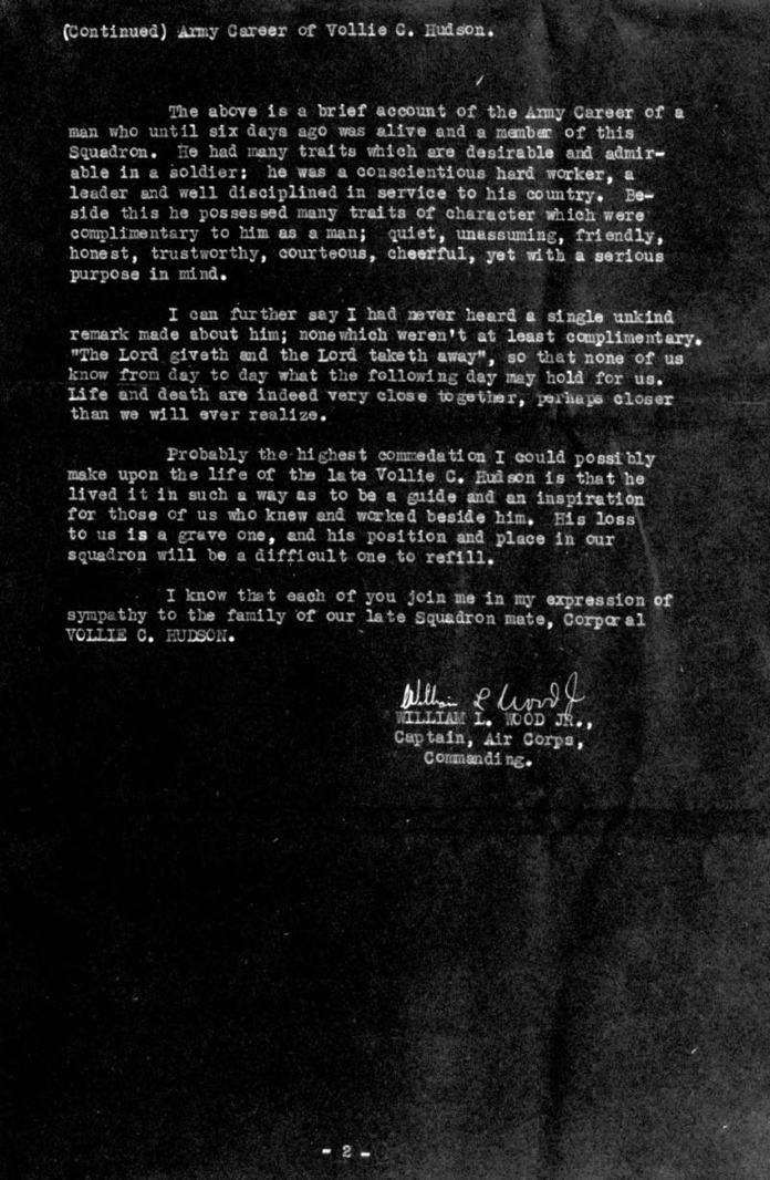 Probably the highest commendation I could possibly make upon the life of the late Vollie C. Hudson is that he lived it in such a way as to be a guide and an inspiration for those of us who knew and worked beside him. His loss to us is a grave one, and his position and place in our squadron will be a difficult one to refill.
