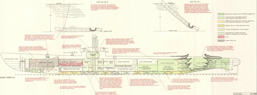 Based on survivors’ accounts, O’Kane later wrote in his report that the crew “leveled the boat off[…] and proceeded to the forward torpedo room carrying the injured in blankets.” Depending on the account, between 30 and 45 men made it to the forward torpedo room, where an escape trunk was located. Leveling off the submarine on the bottom of the Formosa Strait made it possible for most of the survivors to evacuate to the forward torpedo room. Unfortunately, it drastically increased the depth of the water that the survivors would have to escape through.