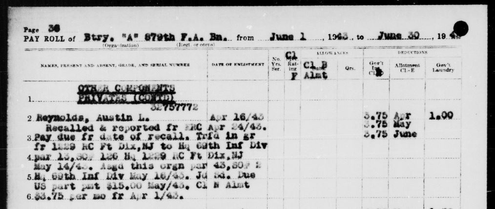 “Pay Roll of Battery ‘A’ 879th Field Artillery Battalion For month of June, 1943.” June 30, 1943. U.S. Army Muster Rolls and Rosters, November 1, 1912 – December 31, 1943. Record Group 64, Records of the National Archives and Records Administration. National Archives at St. Louis, Missouri. https://s3.amazonaws.com/NARAprodstorage/lz/st-louis/rg-064/85713803_1940-1943/85713803_1940-1943_Roll-1345/85713803_1940-1943_Roll-1345_08.pdf