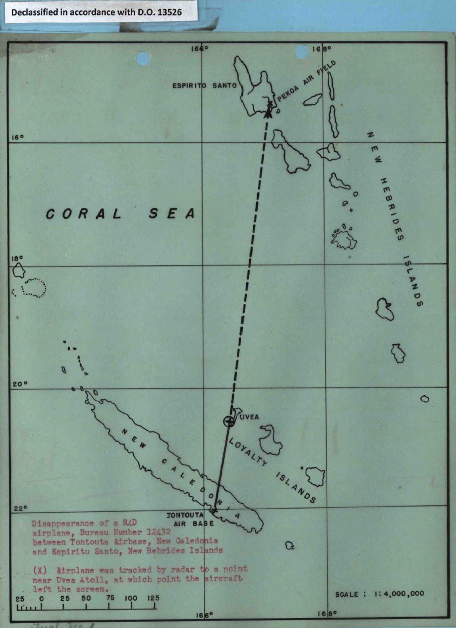 This flight was tracked by radar to a point near Uvea, [sic] Atoll, Loyalty Islands where it left the screen. Intensive searches conducted immediately and continuing for three days failed to produce any trace of plane or crew other than very few small pieces of wreckage in the vicinity of Uvea Atoll, Loyalty Islands.