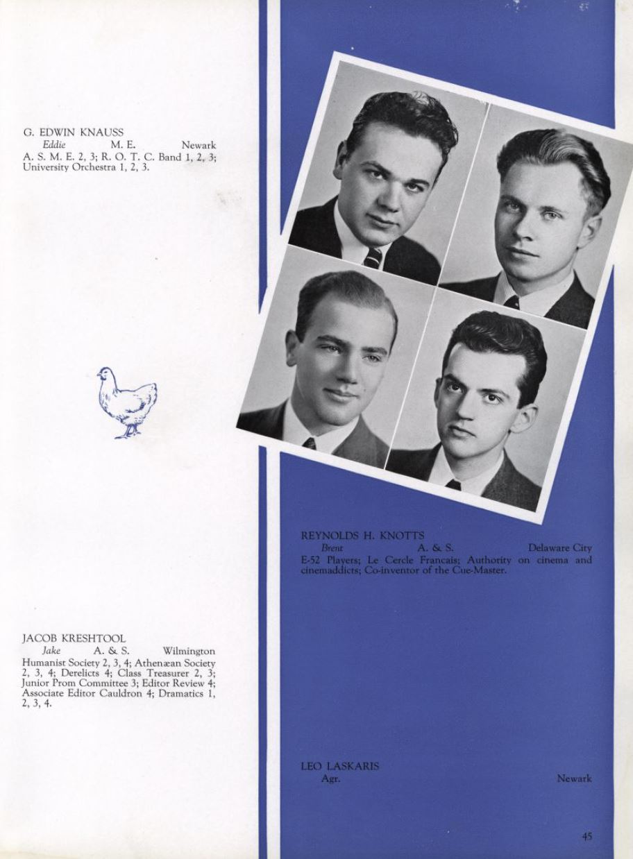 Knotts graduated from Delaware City High School in 1934. The 1939 Blue Hen yearbook recorded his nickname as Brent, listing the following activities: “E-52 Players; Le Cercle Francais; Authority on cinema and cinemaddicts; Co-inventor of the Cue-Master.” He graduated from the University of Delaware in 1939 and worked that summer at the Robin Hood Theater in Arden, Delaware.