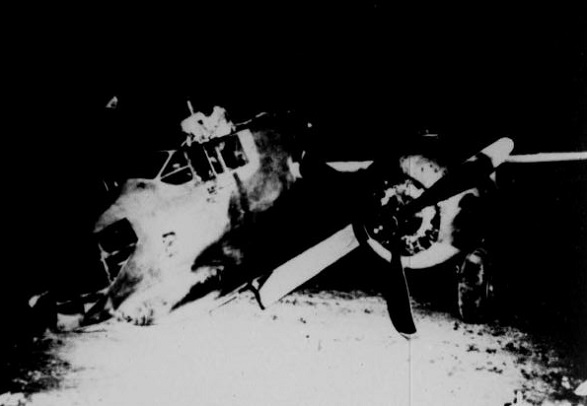 The crash damaged the A-20’s nose and fuselage, wrecked both engines and propellers, and broke both wing spars, but Schoolmaster and his other passenger were unhurt. The investigation committee recommended “that the emergency release mechanism on the escape hatch in the Bombardier’s compartment of this type aircraft be redesigned to let the hatch fall free from the aircraft when the emergency release handle is pulled.” They added that “material failures of the nose wheel tire and the radio were contributing factors to this accident.”