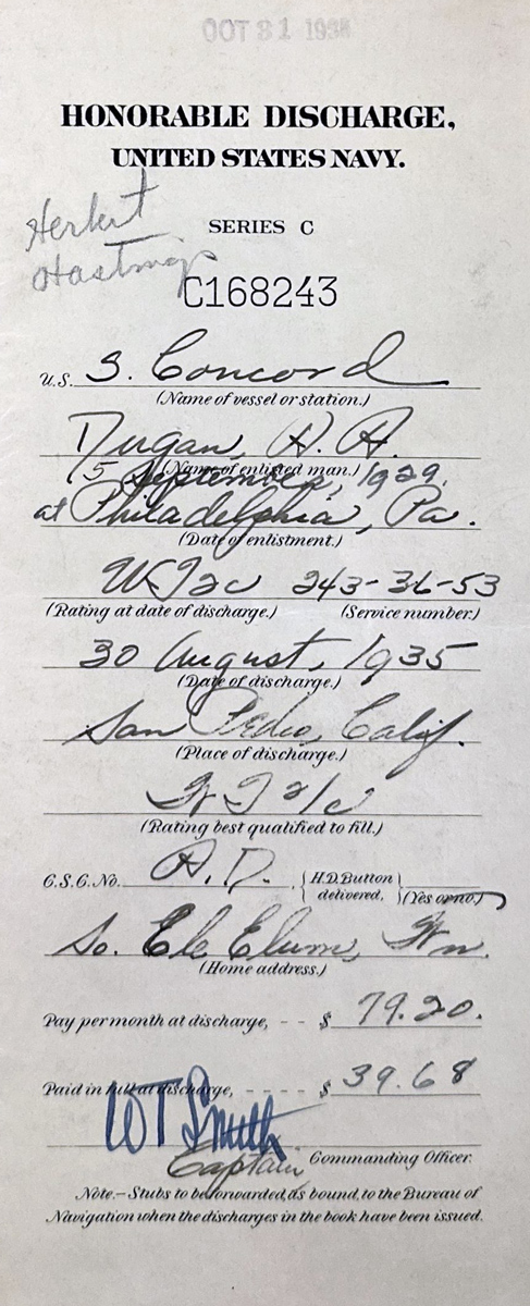 Water Tender 2nd Class Dugan was honorably discharged at San Pedro, California, on August 30, 1935, after five years, 11 months, and 26 days in the Navy.