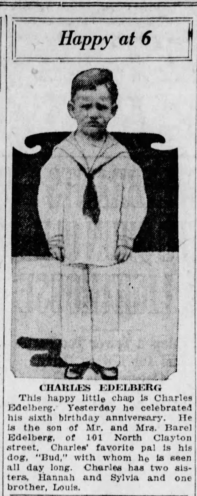 “Happy at 6.” The Evening Journal, April 3, 1926. https://www.newspapers.com/article/the-evening-journal-charles-edelberg-6/133869155/