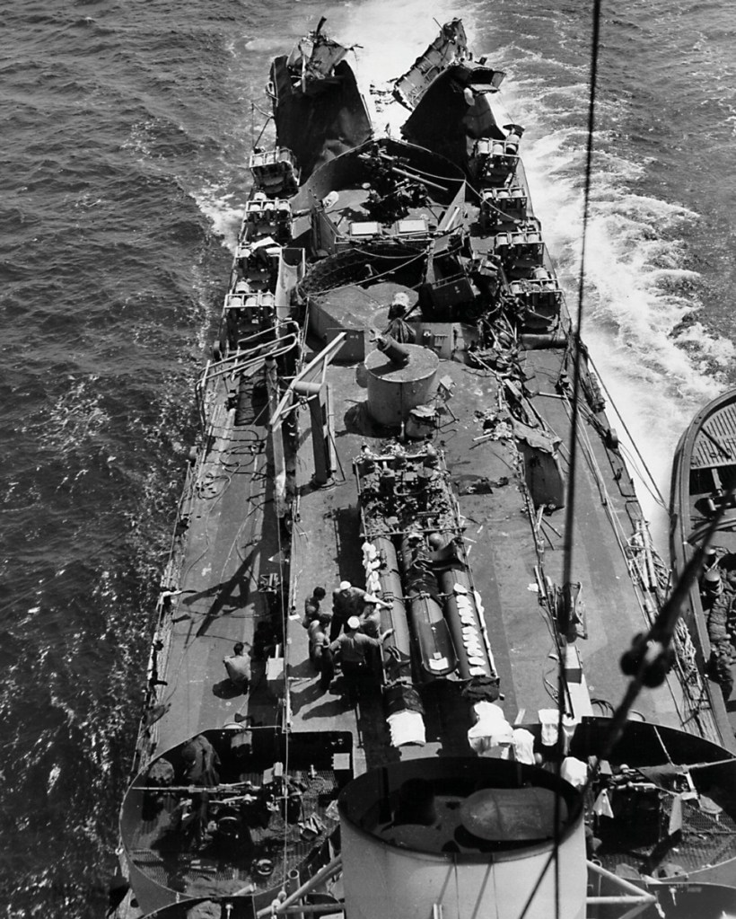 Commander McCabe wrote: “At 0118, a torpedo hit somewhere near the center of the stern with a terrific explosion. […] The explosion carried away both propellers and rudders, and seriously damaged the after 30 percent of the ship.” Menges’s position was approximately 37° 3’ North, 5° 25’ East when she was hit.
