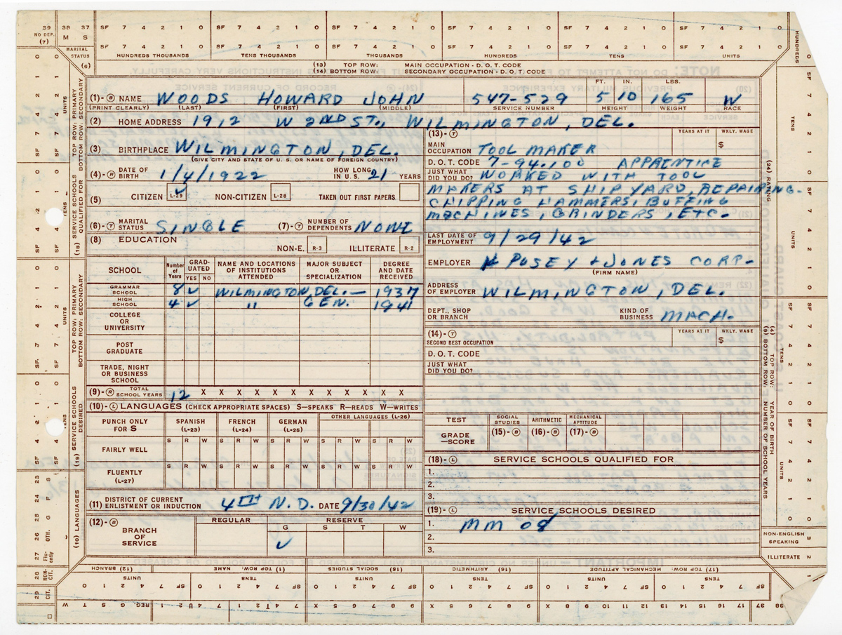 Woods, Samuel. Individual Military Service Record for Howard John Woods. Undated, c. 1946. Record Group 1325-003-053, Record of Delawareans Who Died in World War II. Delaware Public Archives, Dover, Delaware. https://cdm16397.contentdm.oclc.org/digital/collection/p15323coll6/id/21493/rec/2