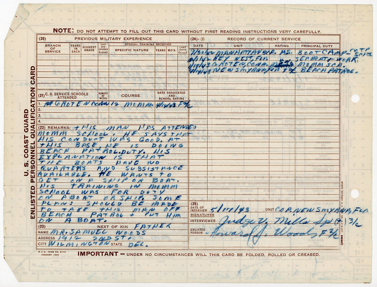 Official Military Personnel File for Howard J. Woods. Official Military Personnel Files, c. 1898–c. 2004. Record Group 26, Records of the U.S. Coast Guard. National Archives at St. Louis, Missouri.