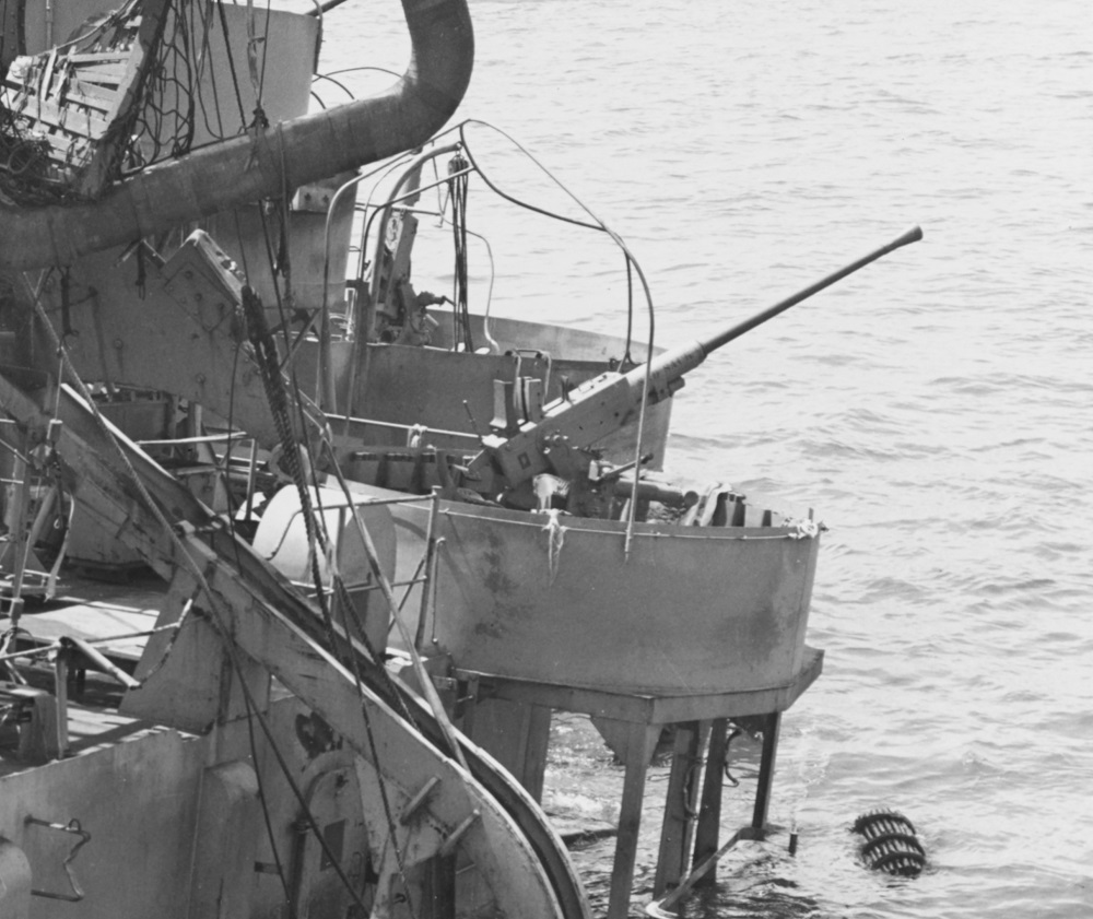 In the port 40MM gun tub when the bomb strikes are: Duane York, baker 2/C, Jack Capps, SK 1/C, John Deel, C 2/C, and Walter Keen, MoMM. Only one has survived — Jack Capps. Jack has suffered a very severe wound in the left arm — almost a complete severance. Someway, not clear, he finds himself outside the gun tub, dazed. He is found by Paul Pearson, EM 3/C, who carries him out through the smoke of the smokepots piled on the boat deck between the port and starboard gun tubs, and hands him down to others who place him in a life raft. […] Cries are heard coming through from the vicinity of the port gun tub. Some of the boys say they can see Duane in the tub by the light of the fire rushing down on them. Walter is not seen again.