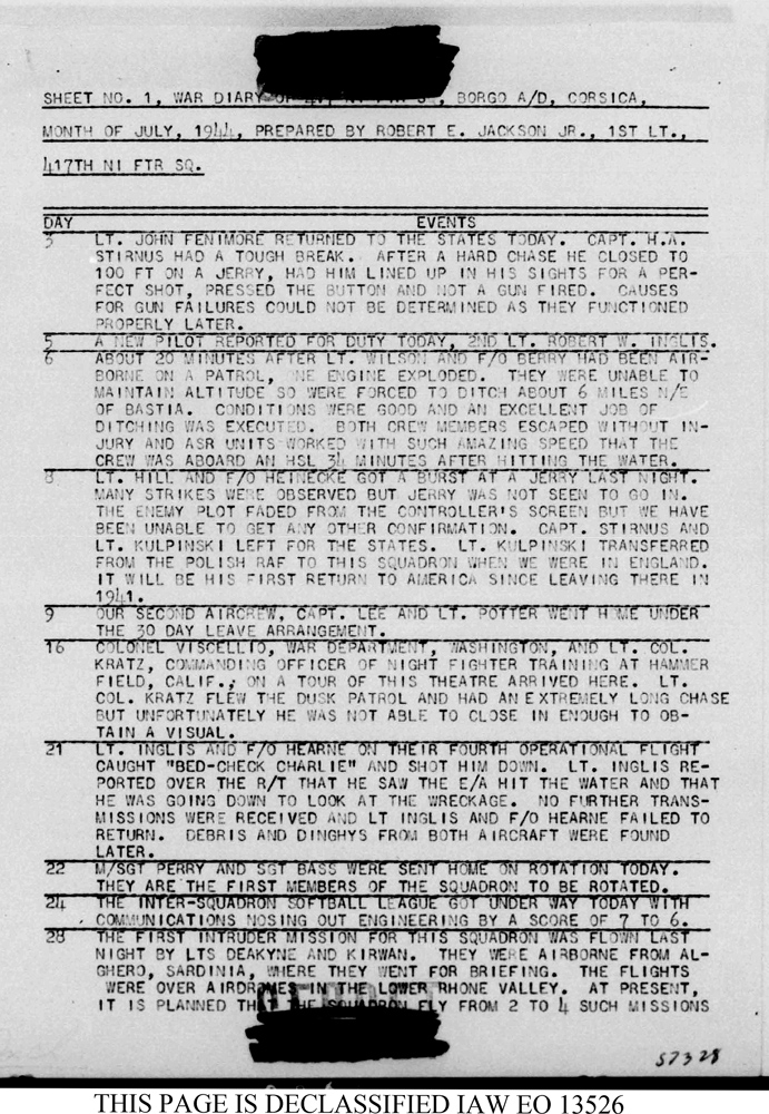 Jackson, Robert E., Jr. “War Diary of 417 NI FTR SQ, Borgo A/D, Corsica, Month of July, 1944.” Reel A0801. Courtesy of the Air Force Historical Research Agency.