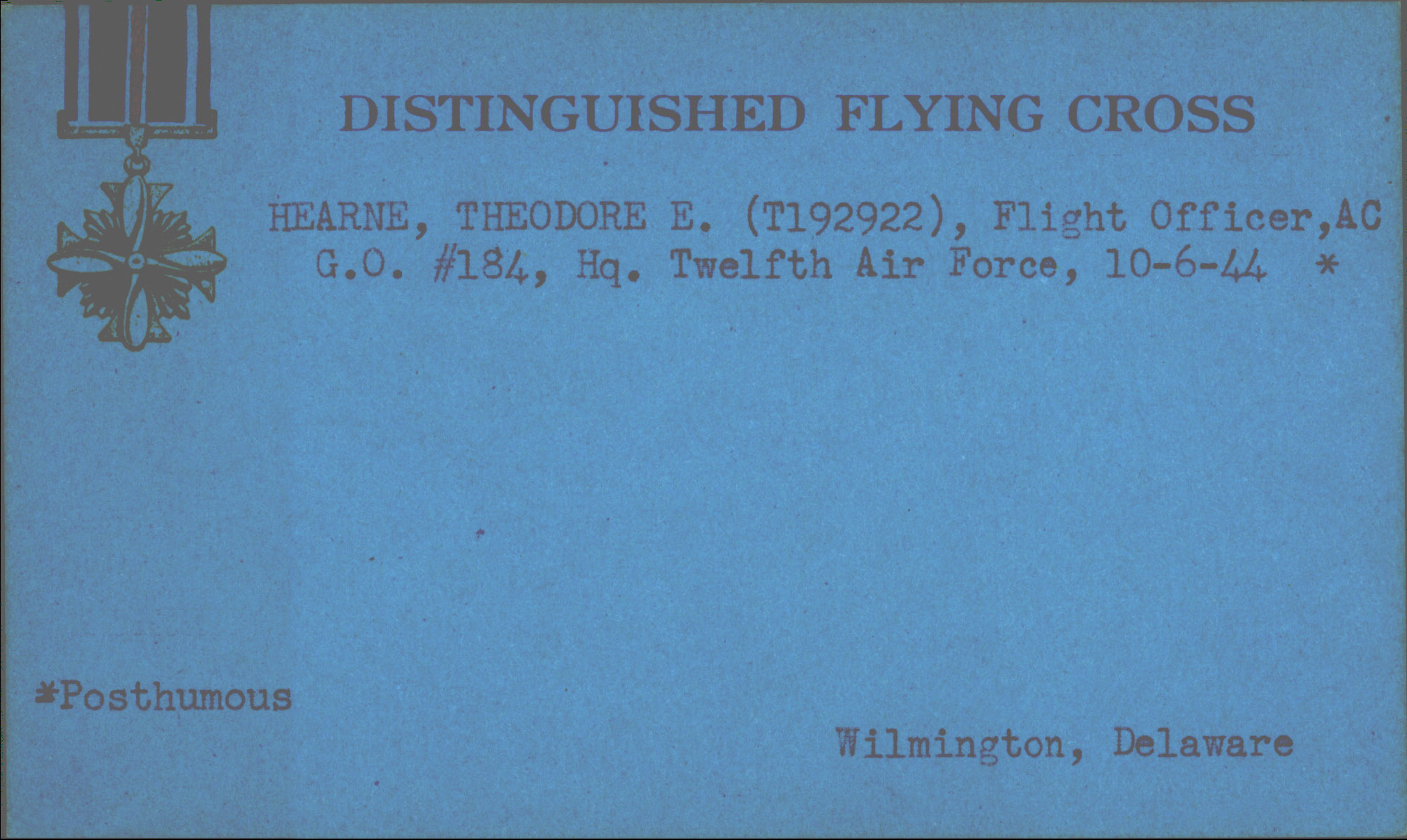 Hearne, Isaac J. Individual Military Service Record for Theodore Edward Hearne. Undated, c. 1946. Record Group 1325-003-053, Record of Delawareans Who Died in World War II. Delaware Public Archives, Dover, Delaware. https://cdm16397.contentdm.oclc.org/digital/collection/p15323coll6/id/19092/rec/11