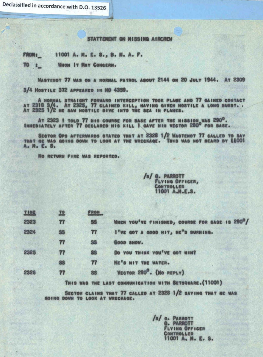 Remarkably, a Royal Air Force controller, Flying Officer George Parrott, provided investigators with a transcript of some of the last transmissions between 11001 A.M.E.S., callsign Setsquare, and Inglis and Hearne’s Beaufighter, callsign Wastenot 77.