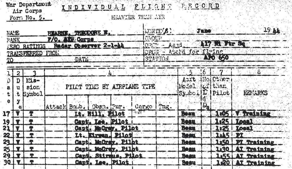 Individual Flight Record for Theodore E. Hearne. May 1943 – July 1944. Individual Flight Records, 1911–1958. Record Group 64, Records of the National Archives and Records Administration. National Archives at St. Louis, Missouri. Courtesy of Lori Berdak Miller and John Mier.