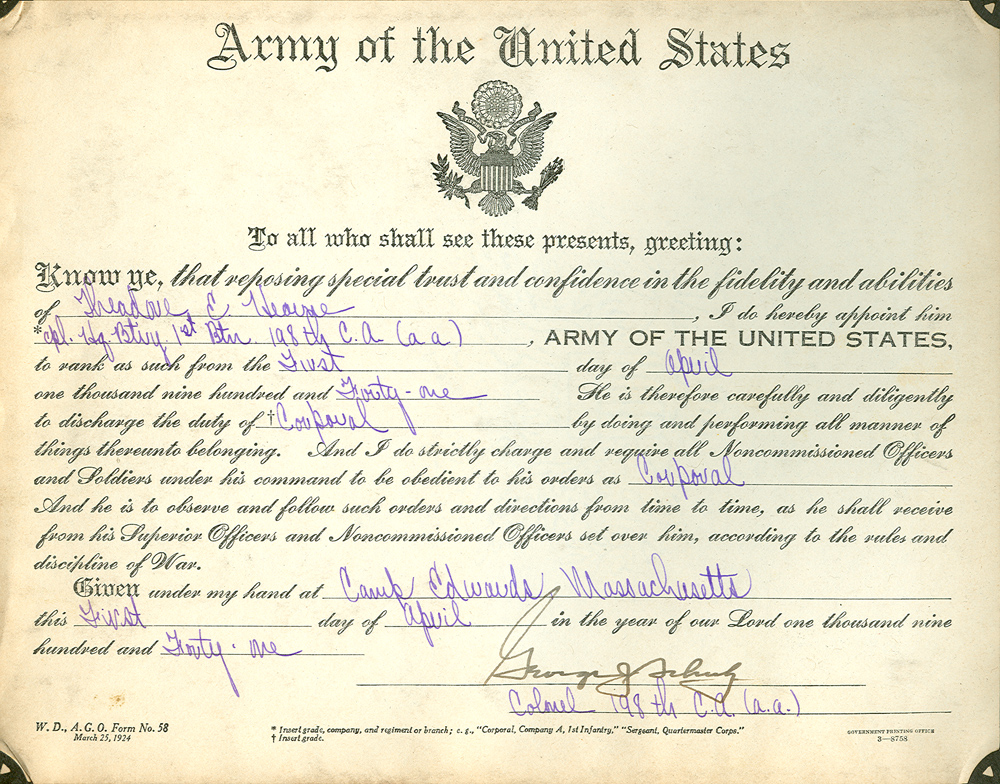On March 26, 1941, the 198th moved to Camp Edwards, Massachusetts. On April 1, 1941, Hearne was promoted to corporal. He was still serving in the 1st Battalion’s Headquarters Battery. The following day, the Wilmington Morning News reported that Corporal Hearne was among a group of men “ordered to attend the 36th Coast Artillery Brigade Intelligence School. This school includes instruction in map reading, camouflage, scouting and patrolling, and identification of aircraft.”
