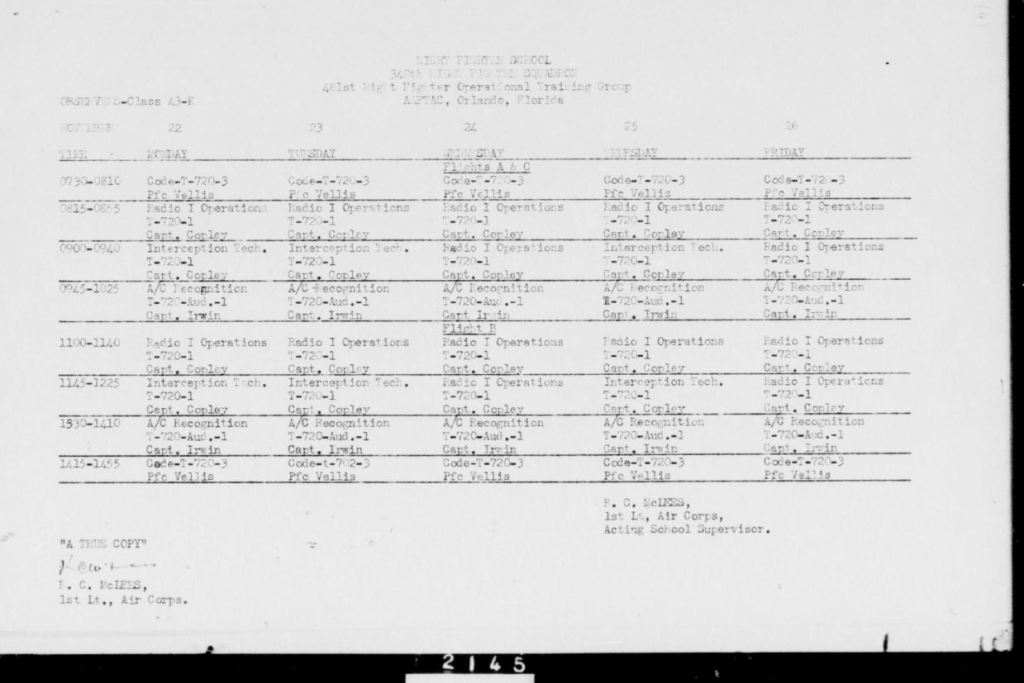 “Historical Data Night Fighter Squadrons AAF Tactical Center Orlando, Florida 1 Oct 1942 – 8 Feb 1944.” Reel A2670. Courtesy of the Air Force Historical Research Agency.